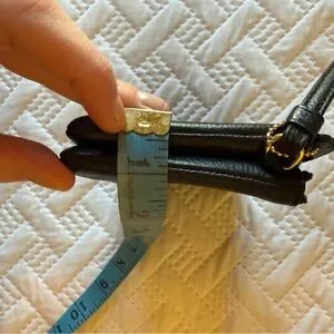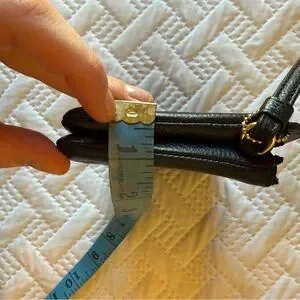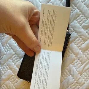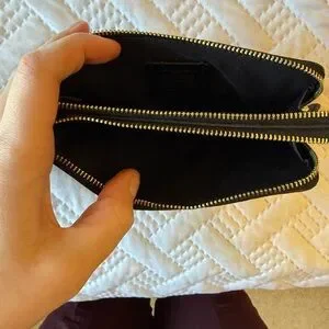 Compact Coach wristlet in black leather. Features gold-tone zipper and hardware. Internal card slots and fabric lining. Two zippered pouches. Convenient wrist strap for carry. Used maybe 1-2 times.