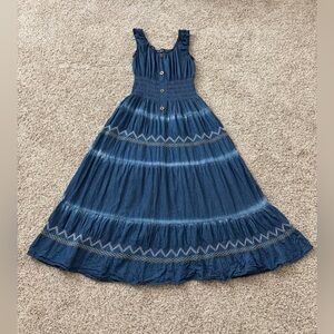 Navy blue casual maxi dress with smocked waist for a flattering fit. Features button-front bodice and ruffle shoulder straps. Lightweight tiered skirt with subtle embroidered accents for effortless style. Perfect for everyday wear and warm-weather outings.