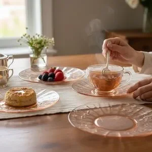 Elevate your tea time with this elegant pink saucer set. The warm amber color adds a touch of sophistication to any table setting.
