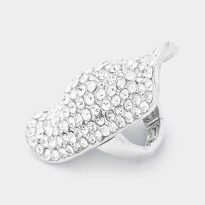 Clear and Rhodium Silver Fashion Statement Jewelry Accessory Long Shell Style Cocktail Stretch Rhinestone Ring