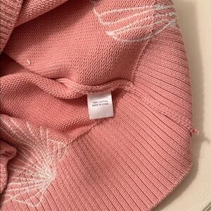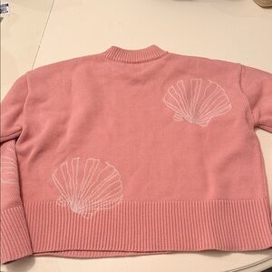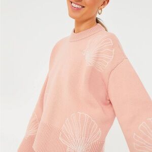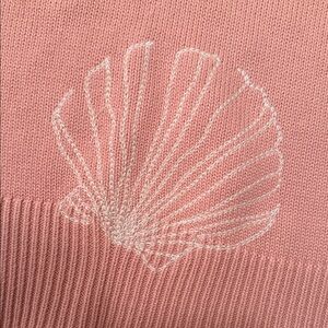 Soft knit crewneck sweater by Tuckernuck. Pink body with white shell motifs. Ribbed collar, cuffs, and hem. Relaxed, cozy fit. Casual, seaside-inspired style.