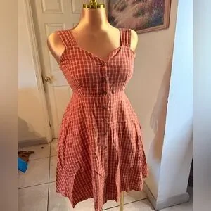 Flattering sleeveless dress with a fitted bodice and button-front closure. Soft rust-pink plaid fabric offers a casual, feminine look. Wide straps and a flared skirt create comfortable wear and easy movement. Perfect for daytime outings and casual events.