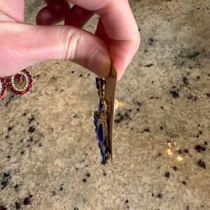Bold royal blue teardrop crystal earrings with sparkling clear rhinestone accents. Lightweight statement design that adds glamour to evening and special occasions. Secure hook backing for comfortable wear. Perfect for pairing with formal and cocktail looks.