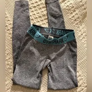 Stylish Gymshark leggings for . Charcoal body with teal waistband. Ideal for active wear.