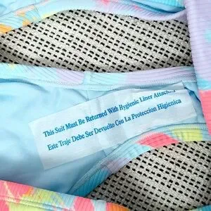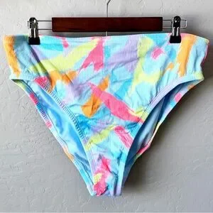Mid rise, high leg swim bottoms by Wild Fable. Light blue with neon paint strokes. Cheeky fit.