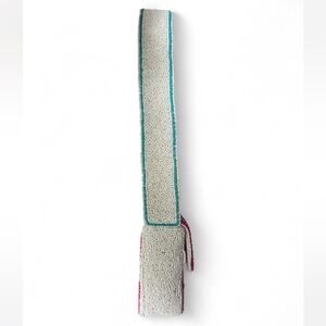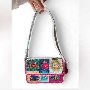 Multicolor embroidered beaded shoulder bag with playful motif details. Lightweight and eye-catching, it adds a vibrant touch to everyday looks. Features a white shoulder strap and colorful beadwork for standout style.