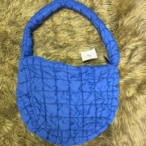 Chic blue quilted shoulder bag with a soft padded handle. Lightweight design with textured quilted pattern for everyday wear. Versatile blue color complements casual and dressy looks. Easy-to-carry, fashionable choice for daily essentials.