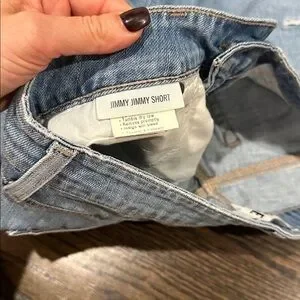 Trendy light blue denim shorts with a distressed look. Features rolled cuffs and classic five-pocket style. Perfect for casual wear.