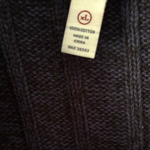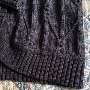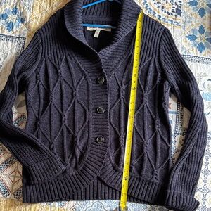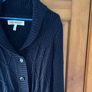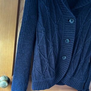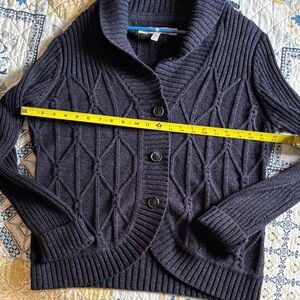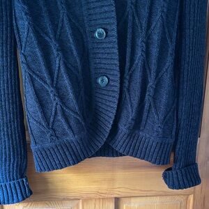 Button-front cardigan with a shawl collar. Cable-knit front panels and ribbed sleeves. Three large buttons for easy closure. Classic black, or dark coal with blue knit, pairs with many outfits. Darkest photos are closet to true color