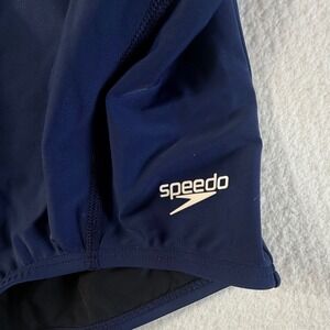 Speedo PowerFLEX one-piece swimsuit offers a sleek, performance-oriented design perfect for competitive swimming or fitness training. Constructed with durable PowerFLEX fabric, it features a racerback silhouette for maximum range of motion and a secure fit. The classic navy blue color is accented by the signature Speedo logo on the hip, while the interior includes built-in shelf bra support for added comfort and coverage during active water sessions.