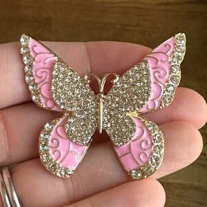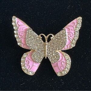 Add a whimsical vintage-inspired touch to your collection with this beautiful butterfly brooch featuring soft pink enamel wings and sparkling rhinestone accents. The intricate swirl detailing and shimmering pave-style body give this piece a timeless, feminine look that instantly elevates any outfit.