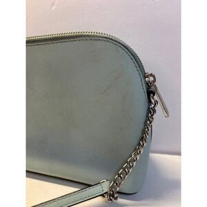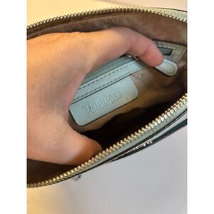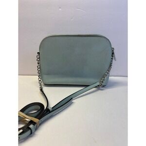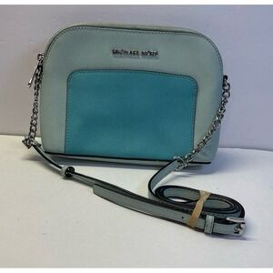 Michael Kors, Cindy blue small Crossbody purse has chain and regular strap adjustable small little pocket on the front. It is in used condition. The back has some reddish pink color. It would be up against your body so it wouldn't be seen however I tried to Mr. clean eraser and it would not come out I'm unsure what it is from Zipper works has signature. Michael Kors liner has a zipper pocket and an open pocket on the inside. smoke free pet friendly home liner has a few marks on the inside from being previously used overall still good condition measures roughly 9 x 6.