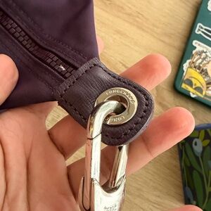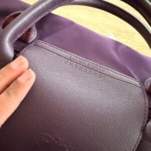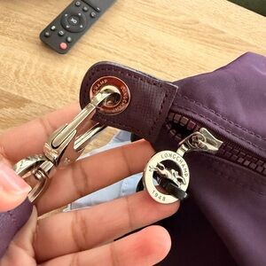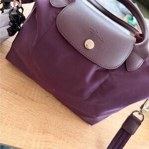 Compact Longchamp shoulder bag in deep purple nylon. Leather flap and top handles. Removable adjustable crossbody strap. Silver-tone snap closure and hardware. Sleek, everyday design.