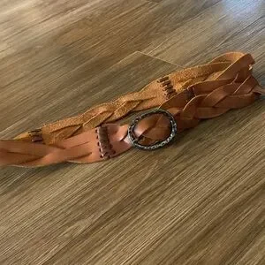 Vintage Womens Braided Brown Tan Leather Belt Small Silver Buckle Boho hippie