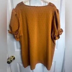 This burnt orange blouse showcases a relaxed fit with delightful ruffled short sleeves, perfect for a stylish yet comfortable look. The soft fabric adds a cozy touch, making it an ideal choice for any casual occasion.