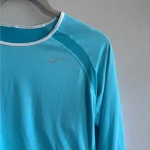 Breathable athletic long-sleeve top. Light blue body with white trim. Lightweight, moisture-managing fabric. Subtle Nike logo on chest. Sporty, versatile layer for training! In great preloved condition!