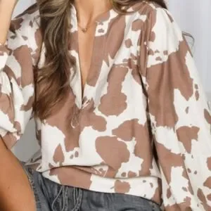 Size L! NWTS! Blouse Western Inspired Cowprint V-neck With Puffy Sleeves