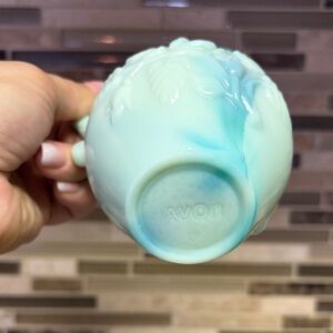 Charming aqua jade pitcher and matching basin bowl with embossed rose detailing. Smooth glossy finish highlights the aqua color. Decorative handle and scalloped rim add elegant vintage-inspired style. Ideal as a tabletop accent or decorative display piece in any room.