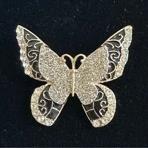 Add a sophisticated vintage-inspired touch to your collection with this beautiful butterfly brooch featuring glossy black enamel wings and sparkling rhinestone accents. The intricate swirl detailing and shimmering pave-style body give this piece a timeless, feminine look that instantly elevates any outfit.