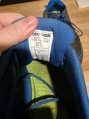 These are Reebok Sublite Alloy Toe athletic safety shoes in a blue/Green colorway. They are size 10E Men. Open Box. Worn