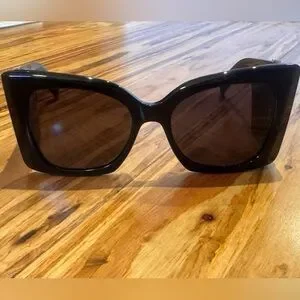 Bold and iconic Saint Laurent (YSL) oversized sunglasses featuring the signature gold-tone YSL logo hardware at the temples ✨ These statement shades have a chunky black frame with a modern, fashion-forward silhouette that instantly elevates any look.