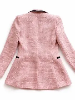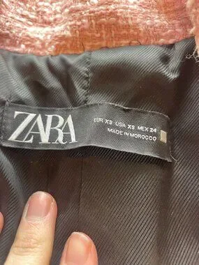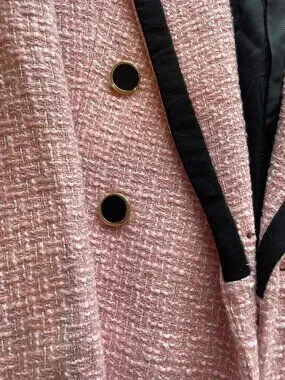 Chic and statement-making, this Zara tweed blazer is the perfect blend of classic tailoring and modern edge. Crafted in a soft pink textured tweed, it features bold black satin trim along the lapels and pockets, giving it a polished, designer-inspired look. The double-breasted silhouette is accented with gold-tone buttons, adding a luxe touch.