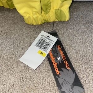 Bright yellow Members Only hooded jacket. Bold cartoon-style graphic accent. Elastic hem and casual zip-front silhouette. Lightweight, playful outer layer. Brand new. Adults medium.