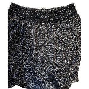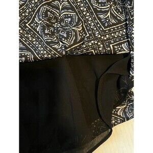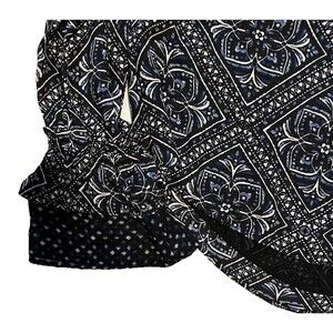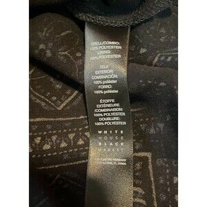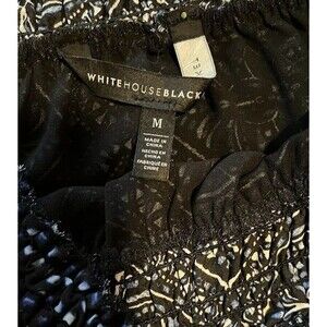 This White House Black Market blouse in size M features a modern bohochic blue print with Fleur De Lis and Diamonds pattern. It has an off the shoulder neckline, long bell sleeves, and is made of lightweight polyester material. The blouse has contrasting accents, a pullover closure, and is machine washable. Perfect for travel, parties, or casual wear in winter, fall, or spring.