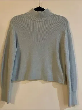Soft light blue turtleneck sweater with a relaxed, modern fit. Ribbed knit detailing at the collar and cuffs for subtle texture. Lightweight and cozy for everyday layering. Easy to style with jeans or skirts.