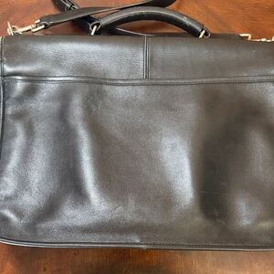 Classic black leather messenger bag with adjustable shoulder strap. Clean, professional design with dual buckle accents. Spacious interior for daily essentials and organized pockets for convenience.