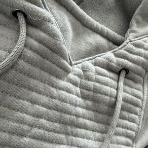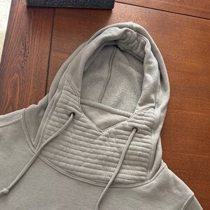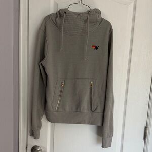 Aviator Nation pullover hoodie. Soft gray fabric with front kangaroo pocket and zip accents. Small embroidered logo in red, orange, and blue on chest. Drawstring hood and ribbed cuffs. Casual and comfortable.