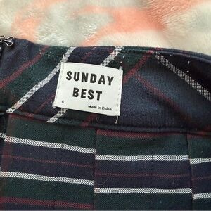 Plaid pleated mini skirt from Aritzia’s Sunday Best line. Size Small/6. Zipper back. Excellent condition, colors are navy, green, white and maroon. Small amount of pilling inside waistband. A-line style, fits high waisted. Can be dressed up or down.