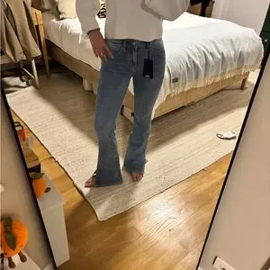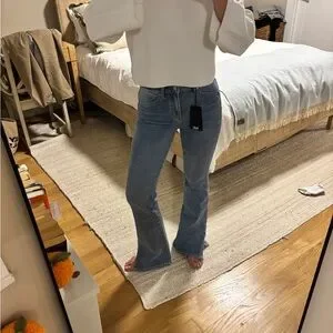 Classic light blue flared jeans with a flattering mid-rise fit. Soft stretch denim for all-day comfort. Versatile style that pairs well with casual or dressy tops. Light blue color adds a fresh, modern look.