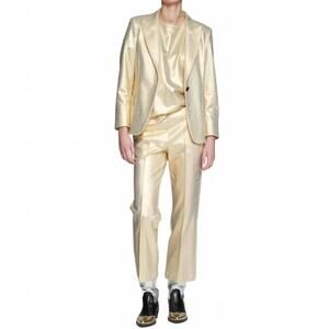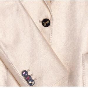 Embrace timeless elegance with the Vilagallo Hillary Stretch Blazer, expertly crafted in a metallic gold cotton blend. This long sleeve blazer boasts an exclusive Vilagallo lining and features convenient patch pockets alongside a notched lapel. Composition: 93% Cotton, 7% Polyurethane. Closure: Vilagallo branded scissors button. Care: Dry clean only. Designed for evening events, this piece encapsulates the essence of quiet luxury for the fall season.