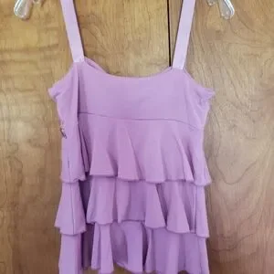 Lightweight, soft dusty rose tank with layered ruffle tiers. Satin ribbon detail at the waist. Super cute & feminine and easy to style.