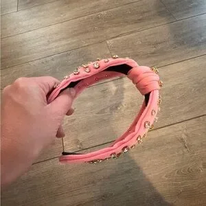 Soft pink knotted fabric headband. Studded with gold-rimmed clear crystals all over. Comfortable padded style. Eye-catching statement accessory.