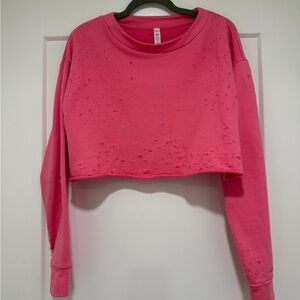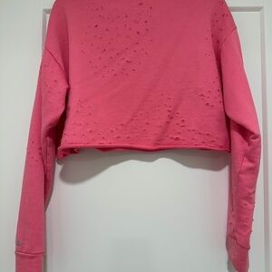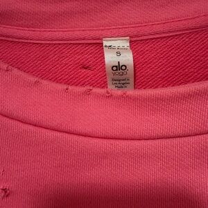 Cropped Alo distressed sweatshirt! Size small. It is in good condition, two small worn areas that I included pictures of (the last two pictures), but they really aren’t noticeable. I just noticed them when inspecting the sweatshirt before posting! Otherwise in great condition an has so much life left!!