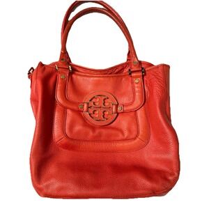 The Tory Burch Amanda Red/Orange Pebble Leather Logo Hobo Shoulder Bag is a stylish and versatile accessory perfect for various occasions. Made of high-quality leather with a magnetic closure, this medium-sized bag features a rectangular shape and double burnt orange handles. The coral orange exterior with gold-plated hardware and logo accents