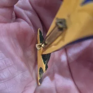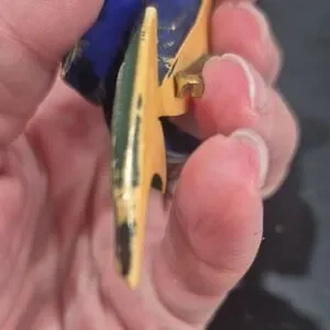 This is a gorgeous Vintage Blue Purple Lilly Hand painted Antique? Flower Brooch. I'm really unsure the age going by the hinge and clasp appears to be antique. It also looks to be made of wood with a laquet on back. Again, I'm no expert so I'm not 100% sure.