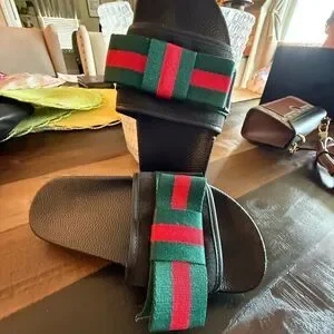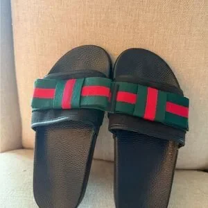 Stylish black slides featuring green and red straps. Perfect for casual wear. EUC (Worn twice)