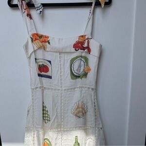 Lightweight white maxi dress with playful printed motif panels. Tie-shoulder straps for a customizable fit. Square neckline and a flowing silhouette for effortless style. Perfect for warm-weather events and casual outings.