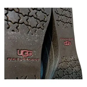 UGG Emalie Brown Leather Shearling Wedge Boot is a versatile choice for winter, fall, and spring. With a round toe, zip closure, and ankle shaft style, these boots feature a stylish buckle accent and UGG logo.