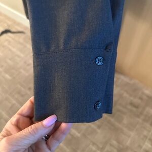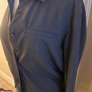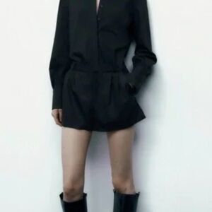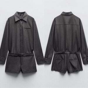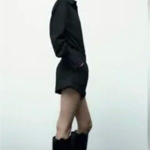 Two-piece matching set. Long-sleeve button-up shirt paired with tailored shorts. Clean lines and minimalist design. Versatile for casual or dressed-up looks.