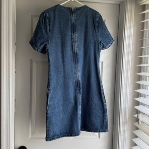 Straight silhouette denim dress. Crew neckline with short sleeves. Subtle seam detailing for a clean look. Has pockets!