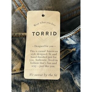 Torrid "3-Inch Heart Print Short" — NWT with original tag attached. Size 18. Raw frayed hem, intentional distressing, allover heart print on medium wash denim. Such a fun summer piece. No flaws — this is straight from the rack.