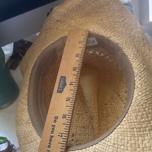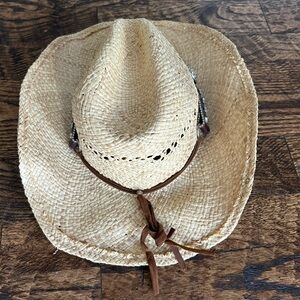 Ride 'em cowboy! But for real, if you're looking for that rugged Western look, able to rope cattle out on the range, the Raffia Straw Cowboy hat is for you. This stylish straw hat has everything you want for that country feel. The stained raffia straw has a worn texture, making it look like it's already seen days of riding. A teardrop crown and front pinch are complemented by the wide airy gaps purposefully designed into the hat. A shapeable wire brim allows alternative looks. The thin leather hat band includes buckle shaped designs and beads, which leads to a handsome chin strap. A cotton sweatband is very comfortable, completing the thoughtful craftsmanship to the hat.