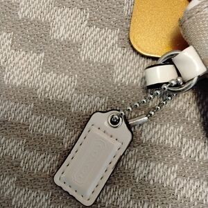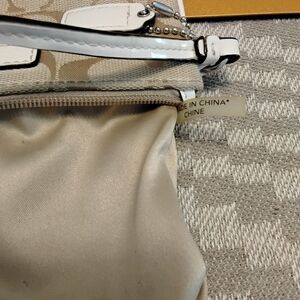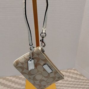 • Beige/tan Coach signature canvas zip wristlet white leather trim
