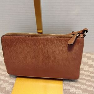 Includes: • Brown pebbled leather Coach wristlet with double zip compartments and wrist strap – great for essentials on the go