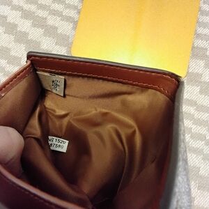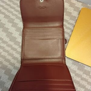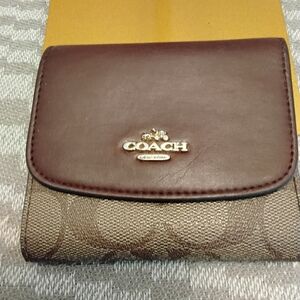 • Coach signature canvas mini trifold wallet with brown leather flap and snap closure – compact but functional. Pre-loved no callouts.