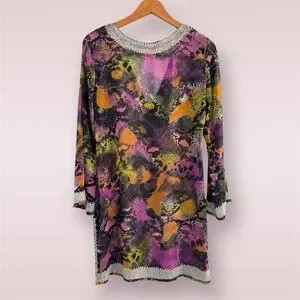 Vibrant Multicolor V-Neck Boho Tunic Top / Cover Up Mini Dress with beaded around neck, sleeves, hem (100% Silk)